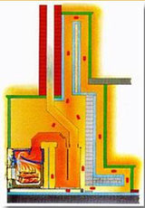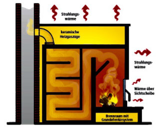 Einem ausschamottiertem Gußeinsatz sind in Schamotte gesetzte Rauchgaszüge nachgeschaltet. Die Warmluft, die um den Gußeinsatz herum entsteht, dient der schnellen Erwärmung des Aufstellraumes und/oder der Beheizung der angrenzenden Räume. Die Züge bieten den Komfort des Grundofens mit lang anhaltender Strahlungswärme. Der Umbau auch hier in Kachelware oder Schamotte.