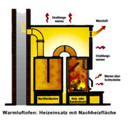Die Wärmeverteilung erfolgt über Warmluftschächte, der Umbau ist wärmespeichernd (Kachelware, Schamotte). Schnell warm, kaum Speicherwärme.